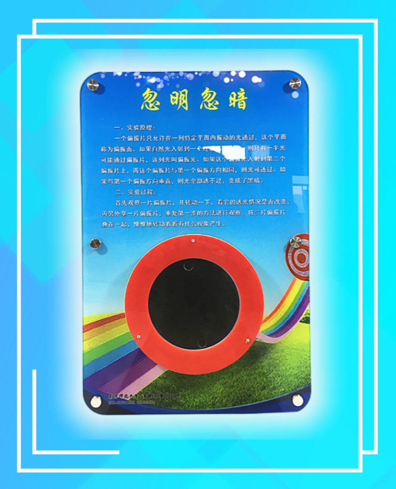 規格:400X600,主要展示器件安裝于亞克力前板上;前板為5mm厚亞克力板,畫面采用UV打印技術,背板采用12mm抗貝特板;前后板可用6顆36mm的工藝螺釘固定于墻體上。采用模塊化手搖發電機構和穩壓穩流技術供電。
