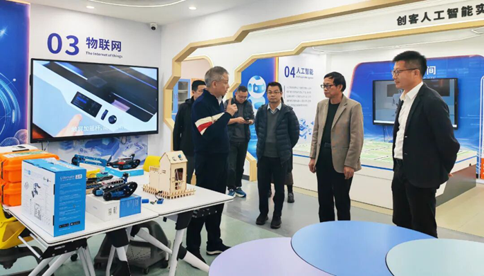 座談會后,在陳登貴董事長的陪同下,曾勝學會長一行先后參觀了創新智慧實驗室、中學AI教考實驗室、人工智能創客實驗室、智慧書法教室等教育裝備數字化展廳,近距離、沉浸式體驗了各應用場景下數字化教育裝備的創新應用與實踐成果,對廣視通先進的經營理念、完善的產品體系以及在教育裝備領域的創新實力給予高度肯定。