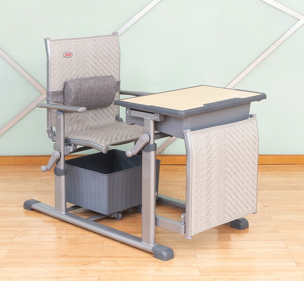 4、課椅規格及材料:460mm*380mm*(座椅面高360mm-460mm可手搖升降調節)±5mm,椅背可調最大傾斜度150°。座靠面料采用符合出口標準,沖擊100KG,靜壓180KG,60分鐘無損,抗紫外線不褪色,使用壽命8年以上的環保PE藤條。藤條規格為寬7.5mm±0.05mm*厚1.2mm±0.02mm,滕面邊沿采用PE材料包邊,尼龍線縫紉固定工藝。椅下設置370*330*190mm±3mm的PP材料的貯物箱,貯物箱底下前部設置雙滑輪,后部設置滑塊,與課椅下雙滑軌(ABS材質,規格315*30*20mm)的卡位裝置結構配合,貯物箱可前后自由限位滑動,可脫卸。