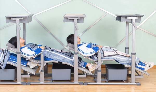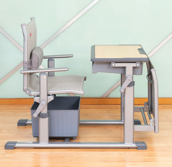 3、課斗規格:360mm*450mm*100mm±3mm,PP塑料一次成型,課斗可水平前后活動80mm,課桌底下前部設置藤質躺板。