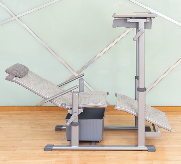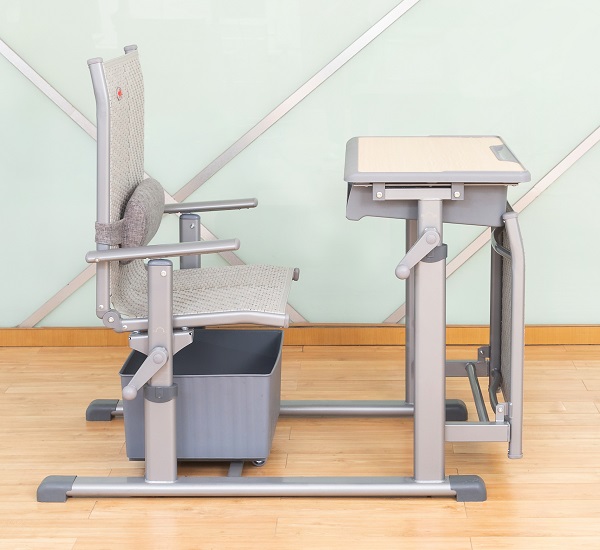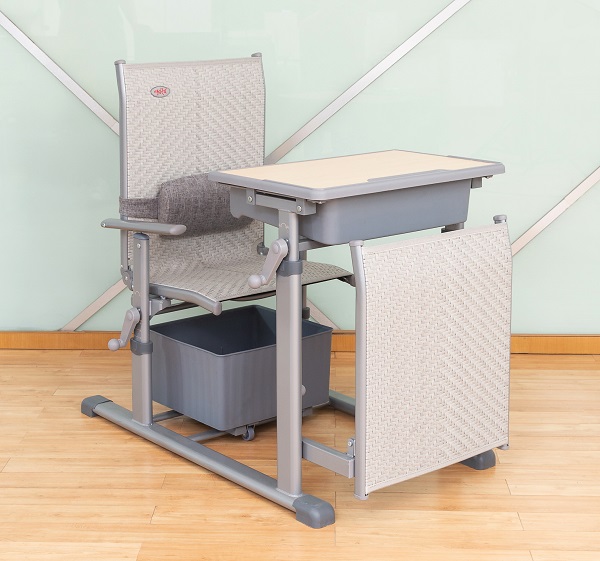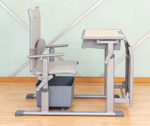 4、課椅規格及材料:460mm*380mm*(座椅面高420mm-460mm可手搖升降調節)±5mm,椅背可調最大傾斜度150°。座靠面料采用符合出口標準,沖擊100KG,靜壓180KG,60分鐘無損,抗紫外線不褪色,使用壽命8年以上的環保PE藤條。藤條規格為寬7.5mm±0.05mm*厚1.2mm±0.02mm,滕面邊沿采用PE材料包邊,尼龍線縫紉固定工藝。椅下設置370*330*190mm±3mm的PP材料的貯物箱,貯物箱底下前部設置雙滑輪,后部設置滑塊,與課椅下雙滑軌(ABS材質,規格315*30*20mm)的卡位裝置結構配合,貯物箱可前后自由限位滑動,可脫卸。