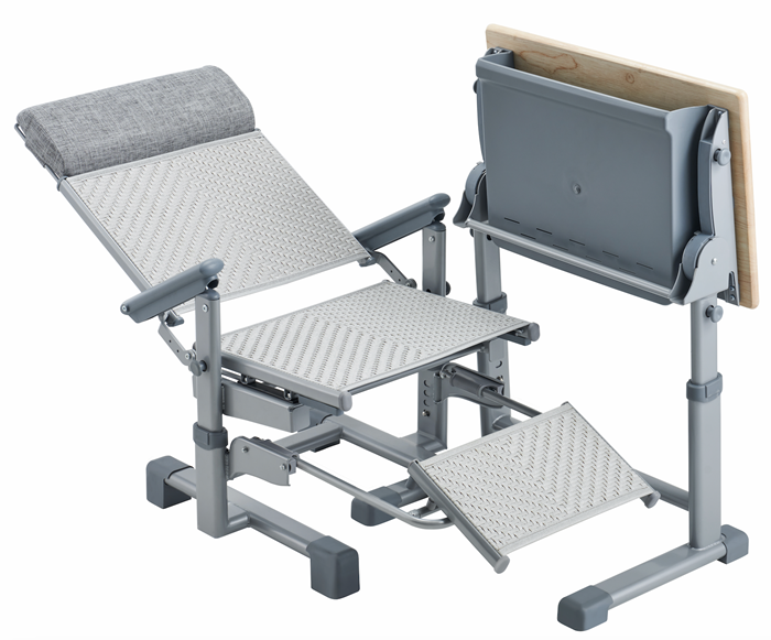 6、課桌椅午休模式:將課桌面板和桌斗通過按鍵變形成垂直模式,將課桌移到課椅側面,并將一側桌腳插入椅腳條和地面的空隙里,插入后整套課桌椅的左右占地尺寸在700mm以內,更好地騰出教室通道空間。課椅底部保持原位,課椅靠背后仰至150度躺椅模式,課椅座面下方水平移出U型腳托支架,支架上設置PE塑料材質的擱腿板,翻轉即可進行使用,可在0.88米前后間距實現150度原位舒適躺休。