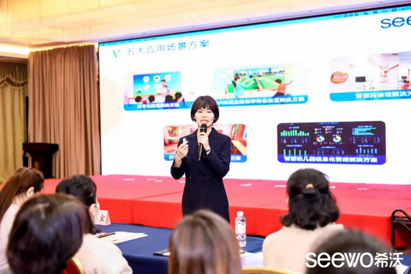 信息化時(shí)代,推動(dòng)科技與教育的融合是大勢(shì)所趨。迎合時(shí)代趨勢(shì),契合科學(xué)幼小銜接的理念,希沃在活動(dòng)現(xiàn)場(chǎng)帶來了智慧幼兒園整體解決方案,致力于推動(dòng)幼兒教育的轉(zhuǎn)型升級(jí)。希沃海口辦客戶顧問梁映雪在現(xiàn)場(chǎng)為與會(huì)者們講解了方案的研發(fā)初衷與諸多功能性亮點(diǎn)。