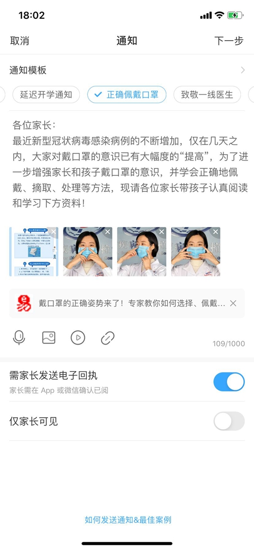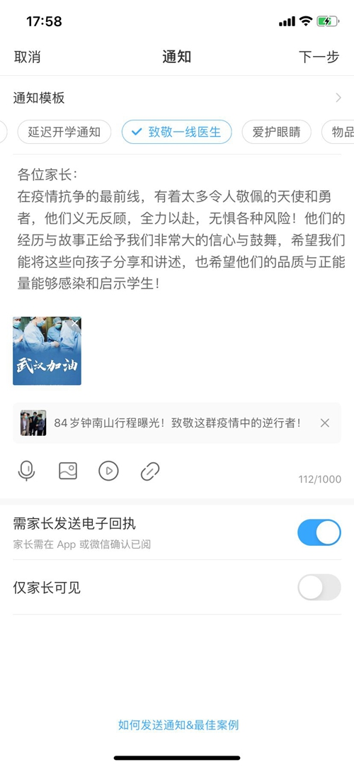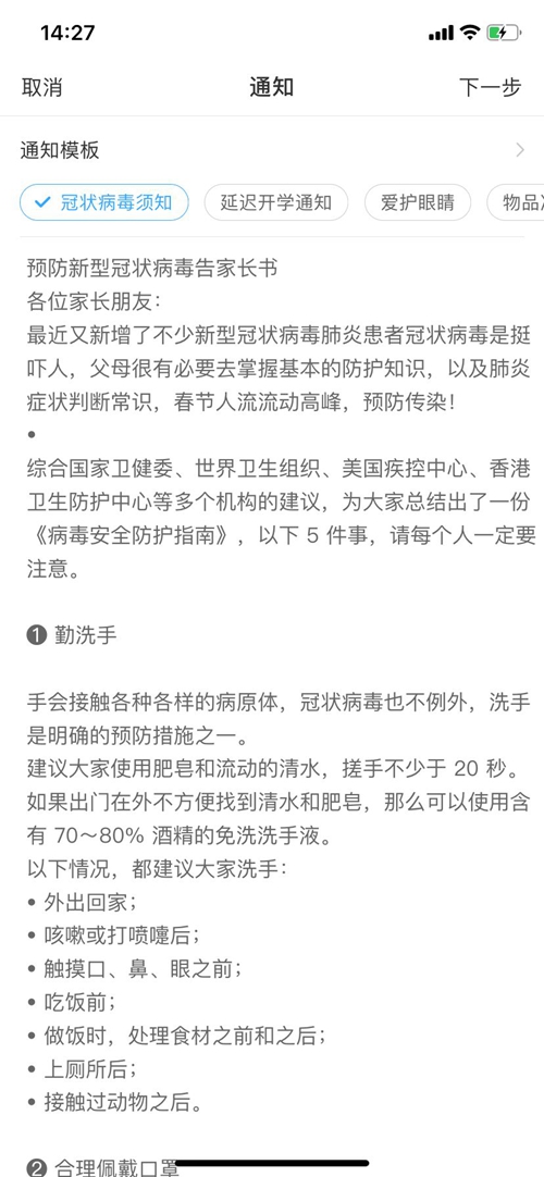 抵御疫情,通知及時性顯得尤為重要。班優(yōu)為老師提供了關(guān)于此次新型肺炎的通知模版,老師只需輕編輯,上傳所需圖片、視頻,就可以向家長、學生科普疫情知識,傳遞正能量。