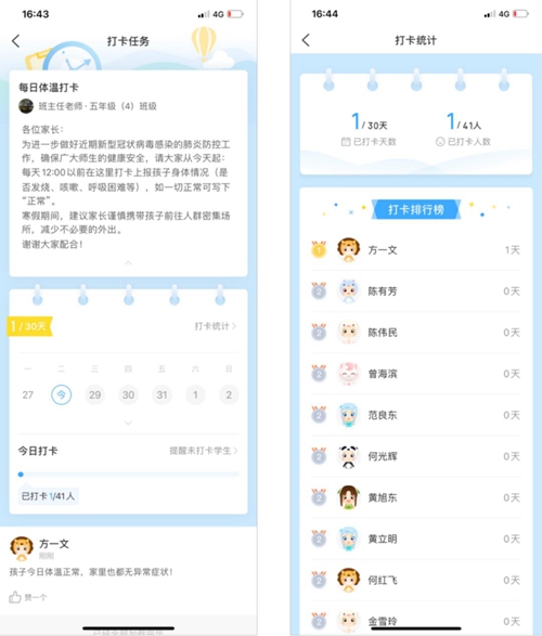 PS:家長每天在后臺完成打卡后,無需老師爬樓登記,系統(tǒng)可自動統(tǒng)計打卡情況,本班學生身體情況一目了然,以便老師開展下一步的防控措施。