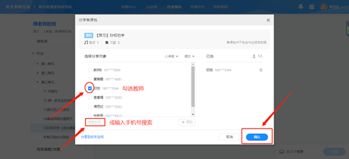 分享的老師可以進入作業報告,選擇好對應的章節,找到要分享的備課包,并點擊分享備課包。在分享的時候,可以直接勾選教師名字,或者輸入手機號碼搜索。值得一提的是,只要是使用希沃易課堂的老師,大家都可以通過手機號碼搜索并分享哦!添加好要分享的老師后,記得點擊確認,這樣便能快速完成跨學科跨學校的“資源+任務”的打包分享。