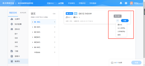 而這些“資源+任務”往往需要學校老師自己制作,為了減輕各位老師的備課負擔,可以充分發揮集體備課以及跨校資源共享的優勢。主備老師可以將“資源+任務”以備課包的形式一鍵共享,其他老師就可以接收并下發給自己的學生。例如,主備老師添加好所有的資源,組成一個預習資料包,將整個資料包分享至任何老師或校本空間。