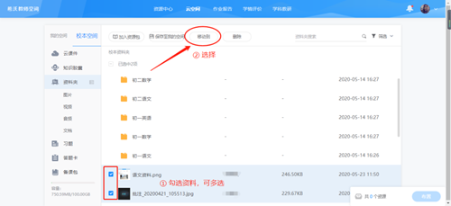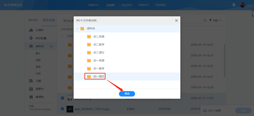 接下來,咱們就可以將文件歸類了~操作非常簡單,勾選對應(yīng)的資料,例如可以選擇所有語文學(xué)科的資料,然后點(diǎn)擊“移動(dòng)到”,就可以放到原先創(chuàng)建好的文件夾了。