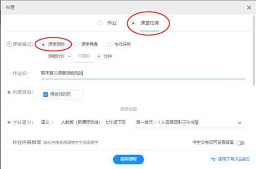 、傩枰崆霸诮處熆臻g設置好對應習題,加入資源包后設定為課堂測驗任務;