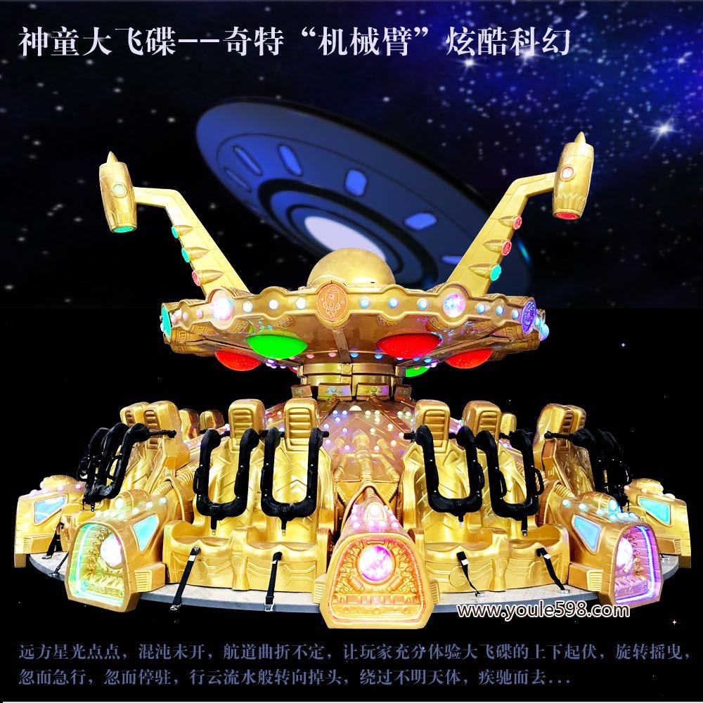 產(chǎn)品詳細(xì)介紹大型游樂(lè)設(shè)備神童大飛碟: 采用高檔玻璃鋼材料,堅(jiān)實(shí)、安全又美觀,配以奢華金色,彰顯尊貴典雅。戶外游樂(lè)設(shè)備飛碟造型炫酷獨(dú)特,設(shè)計(jì)成上下兩層,上層的高效光能轉(zhuǎn)化板讓其能源源源不斷,下層更加龐大圓潤(rùn),精密玲瓏的操控室位于正中央,被外部巨型太空座艙所環(huán)繞”。 獨(dú)特的神秘飛碟造型、炫彩靚麗的外觀、旋轉(zhuǎn)起伏搖曳不定的運(yùn)行方式以及各種引人遐思的太空元素,該游樂(lè)設(shè)備投放之后維護(hù)方便,便于經(jīng)營(yíng),兒童游樂(lè)場(chǎng)投放新設(shè)備神童20座大飛碟,拉動(dòng)您的游樂(lè)場(chǎng)人氣,帶來(lái)新一輪的收益增長(zhǎng)。運(yùn)行特點(diǎn):起伏+旋轉(zhuǎn)+逆轉(zhuǎn)+激情速度。 打造游樂(lè)設(shè)備差異化,增加兒童樂(lè)園設(shè)備的運(yùn)動(dòng)趣味性,神童游樂(lè)開發(fā)出一種先進(jìn)的游樂(lè)設(shè)備偏心旋轉(zhuǎn)技術(shù),應(yīng)用到全新的20座飛碟產(chǎn)品之上,讓玩家乘坐體驗(yàn)感成倍增加。兒童游樂(lè)設(shè)備大飛碟采用全新的全齒輪傳動(dòng)方式,實(shí)現(xiàn)能量高效率轉(zhuǎn)化,同時(shí)設(shè)備運(yùn)行更穩(wěn)定,更安全。 公司擁有專業(yè)的研發(fā)、設(shè)計(jì)、生產(chǎn)、銷售、營(yíng)銷策劃及售后團(tuán)隊(duì),有著多年的電玩城的建設(shè)規(guī)劃、全套的營(yíng)運(yùn)管理經(jīng)驗(yàn);擁有近10年淘氣堡、主題樂(lè)園的規(guī)劃設(shè)計(jì)及全套運(yùn)營(yíng)管理經(jīng)驗(yàn);公司強(qiáng)大的售后技術(shù)服務(wù)團(tuán)隊(duì),為客戶提供24小時(shí)的全天候咨詢、指導(dǎo)服務(wù)。真正理解客戶的需求,真正的幫助客戶得到所需, 互利共贏,致力于讓每一位選用我們產(chǎn)品的客戶成功創(chuàng)造財(cái)富,收益翻番。
