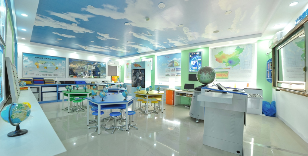 自然地理教室從整體到局部,側(cè)重地球內(nèi)外力作用的表現(xiàn)及水圈的基本特點,主墻面:兩幅彩色語音地圖(中國和世界)莊嚴(yán)大氣,海量信息,滿足學(xué)生查詢需求,頂部:長江、黃河兩條巨龍蜿蜒奔騰,側(cè)墻上:地球內(nèi)外力作用的具體表現(xiàn)歷歷在目,展柜上18種地貌模型形象生動,同學(xué)們可以把自己的觀察結(jié)果與現(xiàn)實生活相結(jié)合,運用3D打印技術(shù),把家鄉(xiāng)的地貌景觀打印成模型和同學(xué)們分享。擺放在教室中部的兩臺大型試驗設(shè)備“水土流失試驗臺和地質(zhì)構(gòu)造形成過程試驗臺”,可以模仿或再現(xiàn)水土流失、不同構(gòu)造地貌的形成過程,如果改變實驗參數(shù)、實驗條件等能夠得出多種不同的結(jié)論。通過參與實驗活動,不但能激發(fā)學(xué)科興趣,幫助學(xué)生們理解、鞏固學(xué)科專業(yè)知識,培養(yǎng)嚴(yán)謹(jǐn)?shù)目茖W(xué)態(tài)度和科學(xué)素養(yǎng),而且有助于學(xué)生們正確認(rèn)識地理環(huán)境各要素之間相互影響、制約的微妙關(guān)系,從而深刻理解自然地理環(huán)境具有整體性與差異性的顯著特點。