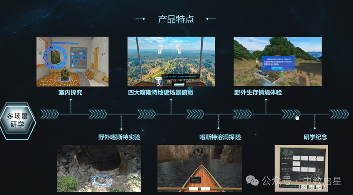 學生此次體驗的地理VR研學喀斯特地貌專題課程,設計了一個完整的野外研學流程,從出發(fā)前的準備、地上喀斯特游覽、尋找喀斯特溶洞到地下溶洞探險,都進行了精心的設計和制作。