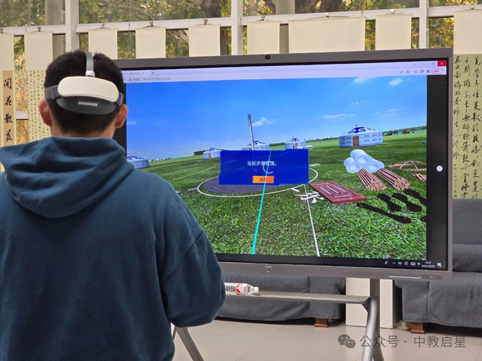 下圖學生體驗的設備是中教啟星地理VR研學系統(tǒng),這是一款基于VR技術(shù)的虛擬研學體驗互動產(chǎn)品。依據(jù)地理新課標,落實地理核心素養(yǎng)而全新開發(fā)的沉浸式教學系統(tǒng)。本系統(tǒng)創(chuàng)設跨時空3D沉浸式研學情境,讓學生在情境學習中認識地貌,在研學過程中培養(yǎng)地理實踐力,致力打造情境教學的腳手架。