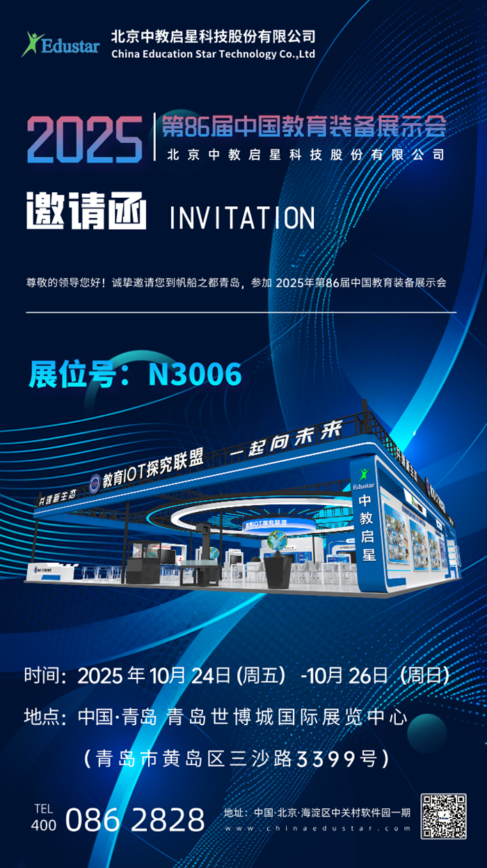 感謝您長期以來對中教啟星的信任與支持!第86屆中國教育裝備展示會開展在即,我們誠摯邀請您于10月24日-26日蒞臨青島世博城國際展覽中心N3006展位,期待與您相聚魅力青島,與我們共話未來、共謀發展。