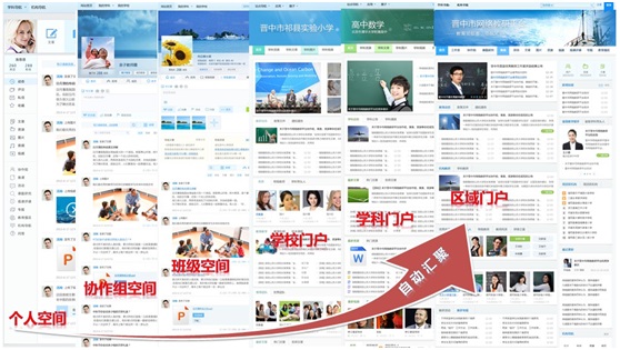 區域空間:區域各級機構、各機構學科各類信息的集中匯聚區,同時也是各級政策的集中發布區、研修動態的集中展現區,為開展區域性教育業務提供全面的支持和服務。省、市、區各級空間融合互通,內容、人員至下而上匯聚,政策、任務至上而下傳達。通過區域空間及業務應用系統,可促使城鎮和農村的學校之間、教師之間實現“手拉手、結對子”, 共同參與各類業務活動、分享優質教育資源,先進幫后進,推動教育公平。