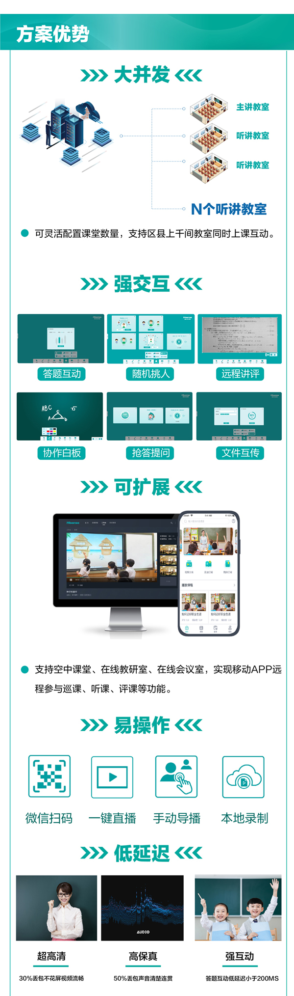 基于“三個課堂”教育政策基礎下的海信“三個課堂+”系統解決方案。全新的海信“三個課堂+”系統解決方案打破傳統“1托3”限制,建立多間“1托N”教學子系統,區域間可實現千間教室同時在線互動學習。該方案不僅可滿足專遞課堂,名師課堂、名校網絡課堂的“三個課堂”的場景應用,同時也可滿足遠程會議、空中課堂、在線教研、“四點半工程”、巡課督導等應用需求。最新版本還創新性的提供了“遠程講評”“答題互動”等功能,搭配協作白板、隨機挑班、搶答等互動工具,打造趣味性課堂互動模式,讓主講老師充分關注到聽講班級的每位學生,即使相隔千里,猶如置身同一課堂。