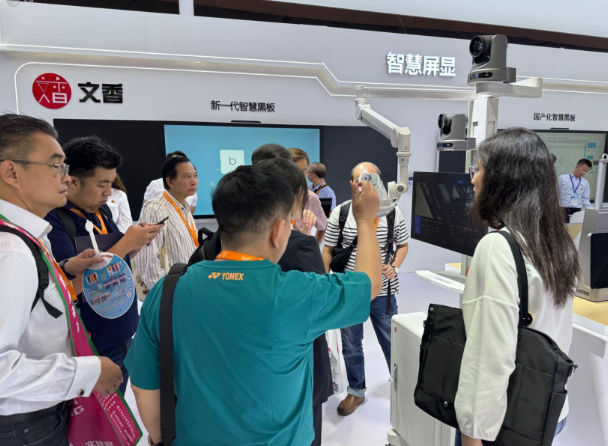 展會現場,文香展示的新一代智慧黑板也備受矚目。全新升級的智慧黑板不僅融合了先進的技術,還充分考慮了教育領域的實際需求,為師生們提供了一個更加舒適、高效的教學環境。設備采用超薄防眩光鋼化玻璃設計,有效地降低了環境光對畫面的干擾,使得畫面更加清晰。其次,內置“護眼+”模式,可以有效減少藍光作用,降低視疲勞,呵護師生雙眼健康。升級四核心主芯片,使得系統流暢性顯著提升。實現傳統教學黑板與智慧黑板之間的無縫切換,不僅讓教師的教學過程更加流暢,也為學生帶來了全新的學習體驗。同時,國產化智慧黑板的展出,不僅體現了我國在教育信息化領域的創新能力和技術實力,更顯示了國產教育裝備在市場上的競爭力與影響力不斷提升。