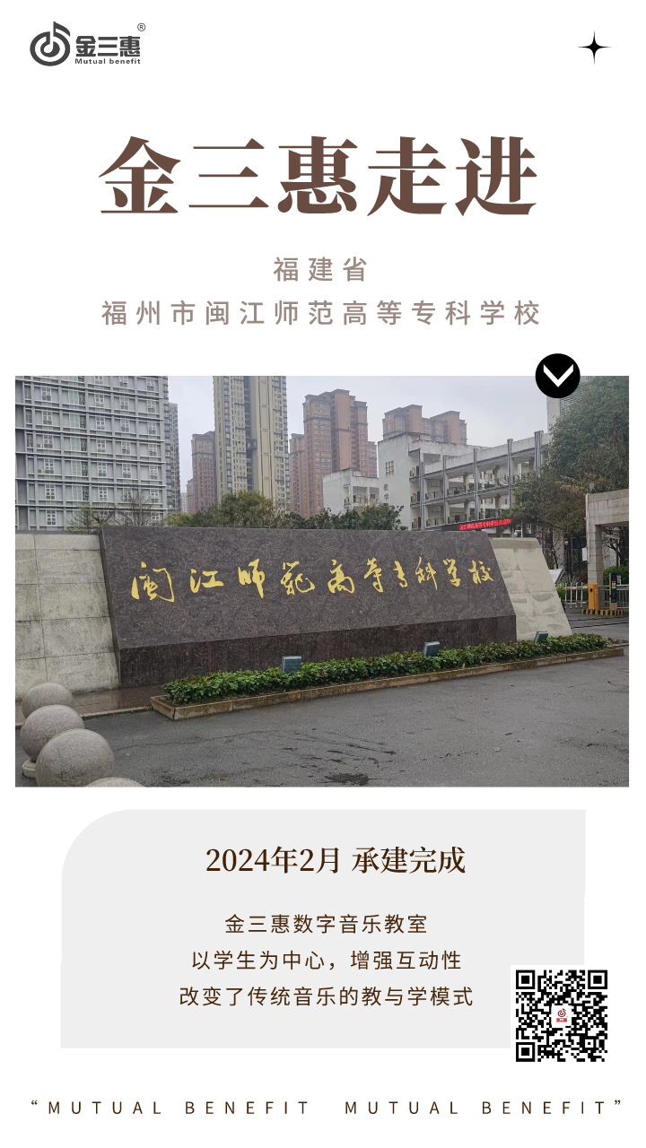 2024年2月,金三惠數(shù)字音樂(lè)教室走進(jìn)福建省福州市閩江師范高等專科學(xué)校,為學(xué)校提供了43+1和40+1的電鋼琴教室,配備了金三惠電鋼琴教學(xué)系統(tǒng)、電鋼琴、數(shù)字音樂(lè)教學(xué)儀等教學(xué)教具等。