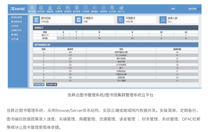 信昇達(dá)圖書(shū)館管理系統(tǒng)采用Browse/Server體系結(jié)構(gòu),實(shí)現(xiàn)云端或局域網(wǎng)內(nèi)數(shù)據(jù)共享。安裝簡(jiǎn)單,定期備份,圖書(shū)編目數(shù)據(jù)提高錄入速度,采編管理、典藏管理、流通管理、讀者管理、財(cái)務(wù)管理、系統(tǒng)管理、OPAC檢索等模塊讓圖書(shū)管理更簡(jiǎn)單便捷。