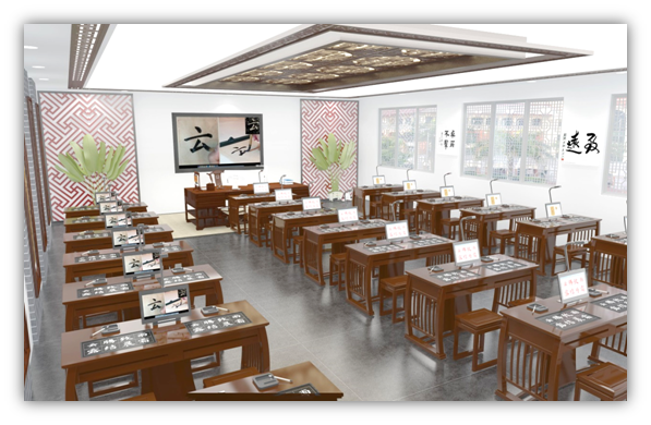 三. EduOffice數字書法雙屏互動教室建設方案 1. 建設思路 《EduOffice數字書法雙屏互動教室教學系統(共享版)》是依據教育部《中小學書法教育指導綱要》和《全日制義務教育語文課程標準》自主研發的數字書法教學系列中的一款高端數字書法教學產品。 系統延續數字書法教學系列產品的“全息書法”核心理念,遵循“指導綱要”中書法教學的規范要求,在全面涵蓋“教、學、練、評、創”各教學環節的基礎上,雙屏方案彌補了單屏方式的缺陷,學生書寫時便于觀看臨摹原帖、示范視頻,更好解決“讀帖、摹寫、臨寫、創作”各類書寫練習需求,有效提高學習效率。 《EduOffice數字書法雙屏互動教室教學系統(共享版)》由觸控一體機、書法教學儀、教師屏、雙屏互動學生書法桌硬件及《EduOffice數字書法雙屏互動教室教學系統授課共享版軟件》、《EduOffice數字書法教學備課軟件》等教學軟件構成,實現師生間教、學、練、評、創的雙向互動教學。 教師通過遠程課堂分組管理,指導學生開展單人學習、小組學習;互動臨摹臺采集與傳輸學生書寫儀與屏幕雙路信號,全程記錄所有學生的書寫過程或在線答題,教師大屏呈現、回放、點評、互評;系統同步記錄學生習作結果和書寫過程,可通過習作結果追溯書寫過程,教師及時糾正指導。 雙屏互動學生端滿足課堂跟學、自主學習,通過內嵌學生軟件進行自主讀帖、臨摹、課堂互動答題,并將習作作品、書寫過程、習題答案提交給教師;使用學生軟件配備的全息碑帖、軟硬筆全息字庫及基礎教程等課件資源,開展篆、隸、草、行、楷等字體的軟硬筆自主學習、書法知識學習;多種臨摹練習方式,觸摸屏顯示下發個性化學習內容,互動臨摹臺實現“讀帖、摹寫、臨寫、創作”的書寫學習需求,雙屏組合讓練習靈活高效;運用華樂學堂的視頻資源在課后開展多種書體拓展學習。 2.建設內容及功能描述 1)建設內容 本項目將建成交付一套完整的《EduOffice數字書法雙屏互動教室教學系統(共享版)》,包括: 1. 書法教學主機系統及輔助硬件 互動系統服務器 大幅面(超A1)教師端書法教學儀16E 教學用21.5寸高清觸控屏 2. 書法互動教室教學軟件系統 書法授課系統 互動教學系統 學生自主學習軟件 硬筆書寫評測軟件 教師示范講評系統 白板互動系統 書法課件播放系統 字帖生成系統 全息書法字庫 書法課件庫與書法云資源 備課軟件 3. 教師書法條案 4. 書法雙屏互動學生桌(2人座,含一體化雙屏互動學習臺、高清臨摹屏) 5. 高清視頻網絡、集控系統及綜合布線 2)功能描述 體系化課件資源,讓教師輕松上好專業書法課 1. 軟筆書法教學資源 1) 與教材配備的課件資源 2) 軟筆楷書、行書、隸書基礎講解課件:300個課件,共1680課時,全息字均具備摹寫動畫、雙路示范視頻(解說版) 3) 與教材同步的隨堂練習課件 4) 書法知識課件: 275個課件,共825課時 2. 軟筆臨摹練習課件 3. 硬筆書法教學資源