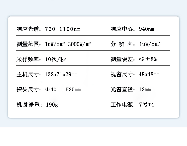 產品型號:LH-131 響應光譜:760-1100nm λp940 測量范圍:1uW/c㎡-3000W/㎡ 分 辨 率:1uW/c㎡ 采樣頻率:10次/秒 測量誤差:±4% 視窗尺寸:48x48mm 產品尺寸:132×71×29mm 探 頭:外置 光窗直徑:12mm 工作電源:AAA(7號)*4