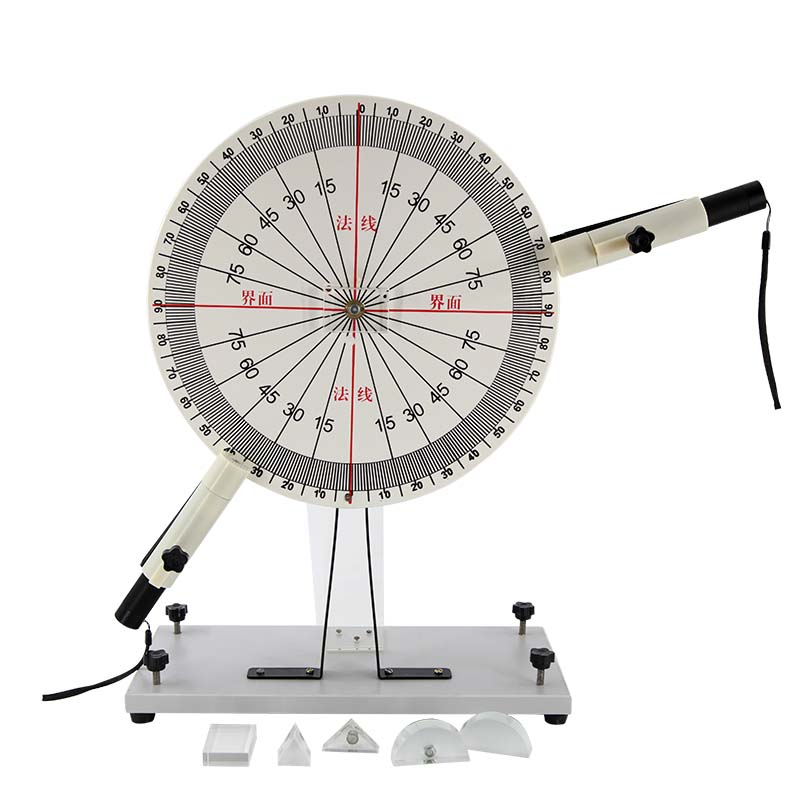 本演示器是中小學光學專用教學儀器,可清晰演示光的直線傳播、光的反射定律、光的折射規律三大核心光學實驗。能直觀顯示入射光線、反射光線、折射光線的傳播路徑與角度關系,幫助學生理解反射定律、折射現象及光路特點,是光學課堂教學與學生探究的必備演示器材。