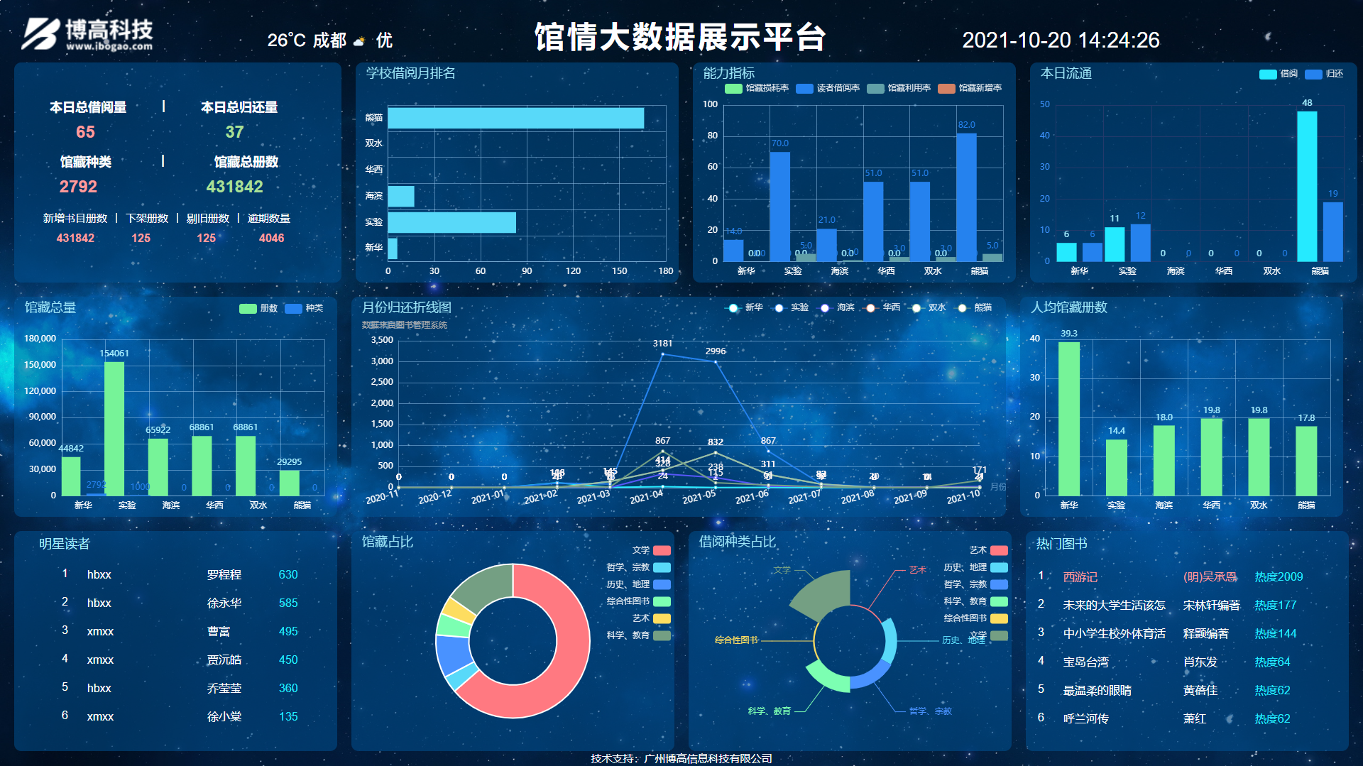 博高智慧閱讀管理(大數據展示平臺或智慧管理運維系統平臺)平臺基于人工智能技術的感知系統,集大數據、物聯網、云計算、人工智能、無線通信等新技術于一體。實現應用子系統的互聯互通,以及數據集成和數據建模等大數據功能,進而充分發揮數據的高階業務價值,對業務管控實現智能聯動、圖形可視、實時調控、高效運營等客戶價值。打造智慧化圖書館,持續性的獲取圖書館客群數據,對數據進行統計與分析,幫助圖書館進行精準化營銷與管理。