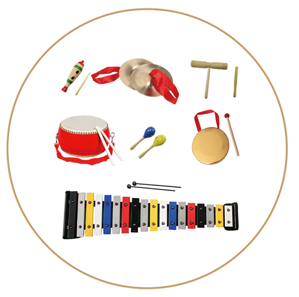 為了配合晨語智能古箏進行小樂隊表演,演奏更加豐富的曲風曲目,中國音樂蒙學智慧教室同時配備了中國小打擊樂套裝,包含以下小打擊樂器:中國鼓、小鑼、小镲、雙響筒、刮胡等。