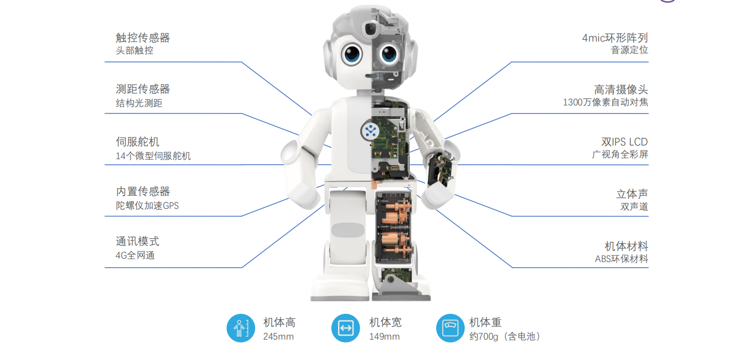 產(chǎn)品詳細(xì)介紹1、運(yùn)動(dòng)控制能力 悟空外觀采用黃金比例設(shè)計(jì),配置優(yōu)必選自主研發(fā)高精度伺服舵機(jī),模擬人體各主要關(guān)節(jié),巧妙設(shè)計(jì)14個(gè)自由度,能模擬舞 蹈、功夫、點(diǎn)頭、行走、坐下、跌倒爬起等數(shù)百種人體動(dòng)作,靈活穩(wěn)定,極具科技感。豐富的動(dòng)作和舞蹈帶來(lái)更生動(dòng)的體驗(yàn)。 2、AI語(yǔ)音交互能力 采用騰訊叮當(dāng)智能語(yǔ)音交互平臺(tái),搭配4個(gè)全向麥克風(fēng)陣列及0.8W雙獨(dú)立全頻揚(yáng)聲器,結(jié)合領(lǐng)先的聲源定位技術(shù),準(zhǔn)確識(shí)別 并響應(yīng)各方向來(lái)的語(yǔ)音交流。同時(shí),內(nèi)置豐富的語(yǔ)料和內(nèi)容資源資源,無(wú)論是聊天、語(yǔ)音控制還是信息查詢(xún),一切方便快 捷,真正做到聽(tīng)得清、聽(tīng)得懂、答的上。 3、AI視覺(jué)能力 悟空前額配置了1300W自動(dòng)對(duì)焦、電子防抖高清攝像 頭,可輕松實(shí)現(xiàn)語(yǔ)音拍照、遠(yuǎn)程監(jiān)控和視頻通話(huà)。結(jié)合 領(lǐng)先的AI視覺(jué)識(shí)別技術(shù),可精確識(shí)別人臉、200+物體 和10000多本中外繪本識(shí)別及數(shù)十種手勢(shì)。 4、豐富的傳感器 悟空胸前搭載TOF紅外傳感器,支持0.5~1m障礙檢測(cè)和距離檢測(cè);內(nèi)置三軸加速傳感器和陀螺儀,支持運(yùn)動(dòng)平衡檢測(cè);另外 頭頂配置觸碰傳感器,配合1.22寸全彩色I(xiàn)PS高清TFT顯示屏作為眼睛,提供多種摸頭殺動(dòng)作表情,充分展示豐富情感交互。 5、圖形化編程 針對(duì)不同年齡和不同學(xué)習(xí)方式,適配手機(jī)/PAD和PC硬件,分別提供Blockly和Ucode兩種圖形化編程方式,滿(mǎn)足 不同年齡段少年兒童學(xué)習(xí)需求。通過(guò)不同的編程塊可調(diào)用悟空機(jī)器人的語(yǔ)言,視覺(jué),運(yùn)動(dòng),傳感,燈光等多種能 力,鍛煉學(xué)生邏輯思維能力的同時(shí),可以讓學(xué)生真正的接觸人工智能,讓知識(shí)能夠?qū)W以致用。 |