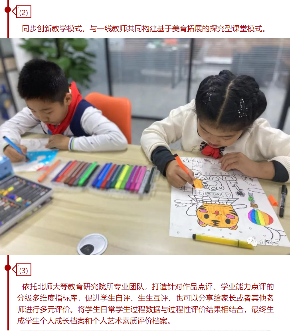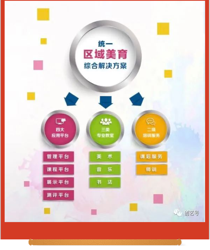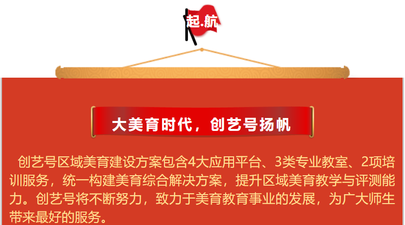 | 區(qū)域美育整體解決方案。創(chuàng)藝號(hào)美育綜合建設(shè)方案,做到“三建設(shè),三提升”,建設(shè)美育創(chuàng)新型課程模式,提升區(qū)域整體教學(xué)能力;建設(shè)美育發(fā)展性評(píng)價(jià)體系,提升學(xué)生藝術(shù)綜合素養(yǎng);建設(shè)美育專業(yè)化場(chǎng)地課程,提升學(xué)校優(yōu)質(zhì)特色發(fā)展,有效服務(wù)美育進(jìn)校園、進(jìn)中考。 |