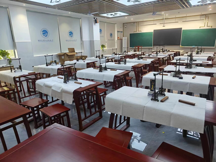 仿古實(shí)木書法桌、專業(yè)筆掛、硯臺(tái)池一應(yīng)俱全;墻飾以國(guó)學(xué)經(jīng)典字畫,配備了現(xiàn)代化的多媒體教學(xué)設(shè)備,方便老師示范運(yùn)筆細(xì)節(jié),實(shí)現(xiàn)傳統(tǒng)與現(xiàn)代的完美融合。