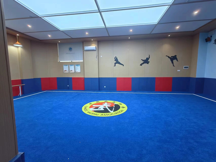 鋪設(shè)專業(yè)武術(shù)軟墊,有效保護(hù)學(xué)生在翻滾跳躍時(shí)免受傷害;墻飾以“武道”渲染,整個(gè)空間洋溢著陽(yáng)剛正氣與紀(jì)律感。
