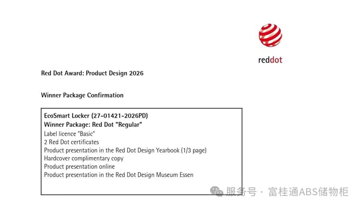 近日,富桂通EcoSmart智能儲物柜憑借前瞻性的設(shè)計(jì)理念、極致的產(chǎn)品體驗(yàn)與硬核的創(chuàng)新實(shí)力,成功斬獲2026年德國紅點(diǎn)產(chǎn)品設(shè)計(jì)大獎(RedDotDesignAward)。這是繼拿下德國IF設(shè)計(jì)大獎后,富桂通在國際設(shè)計(jì)領(lǐng)域收獲的又一重磅榮譽(yù),一舉拿下德國兩大頂級設(shè)計(jì)獎項(xiàng)的“大滿貫”,用實(shí)力證明了中國智造的設(shè)計(jì)力量!