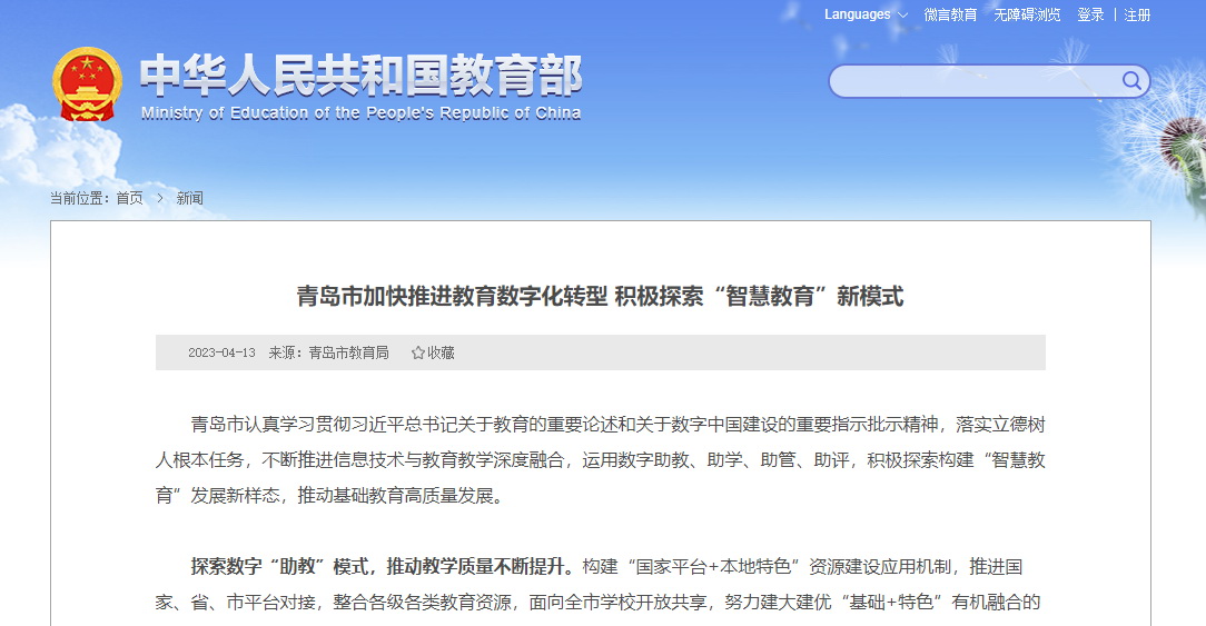 近年來,青島市不斷推進信息技術與教育教學深度融合,積極探索構建“智慧教育”發展新樣態,推動基礎教育高質量發展。教育部網站戰線聯播欄目以《青島市加快推進教育數字化轉型 積極探索“智慧教育”新模式》為題,推廣青島市教育數字化轉型的經驗做法。