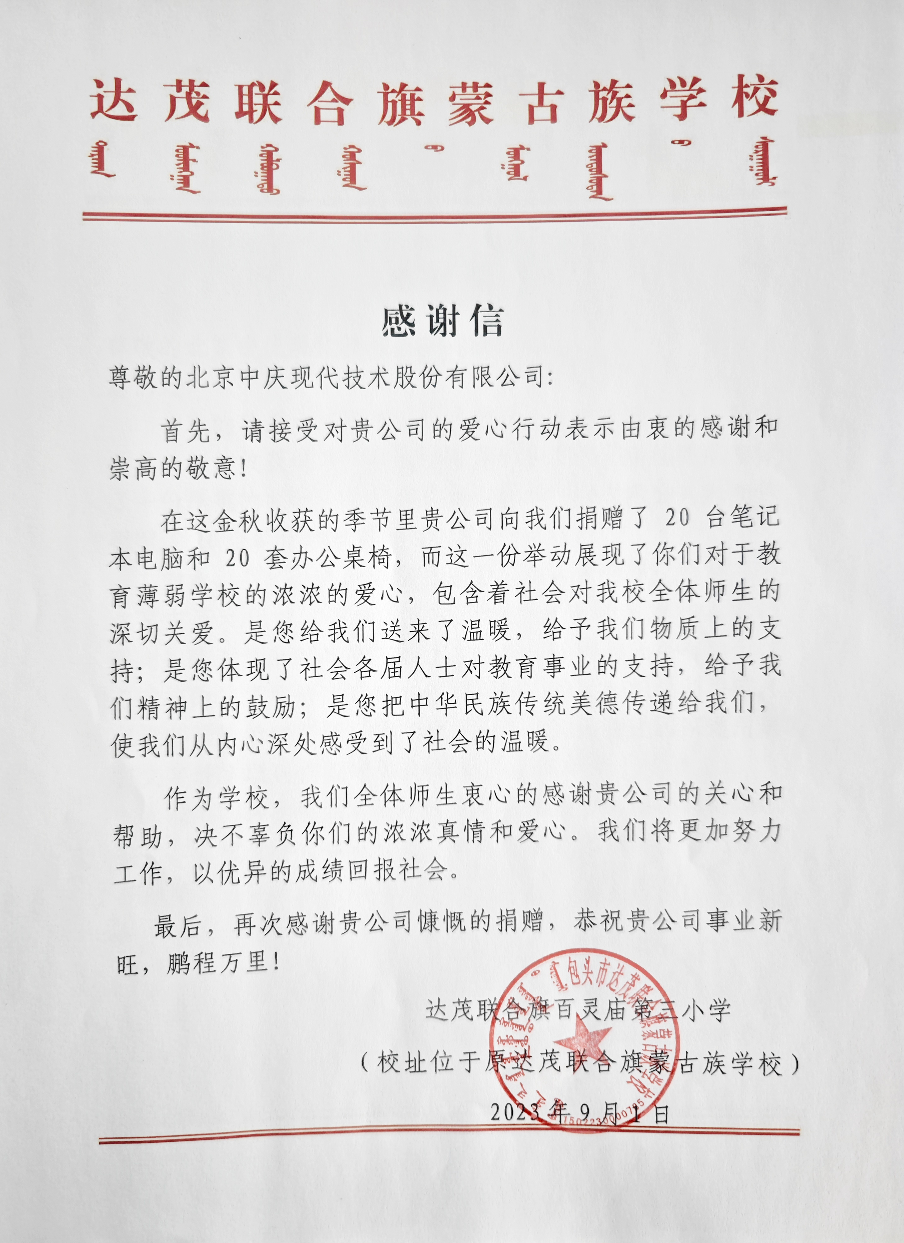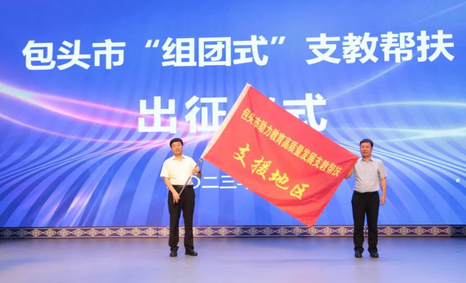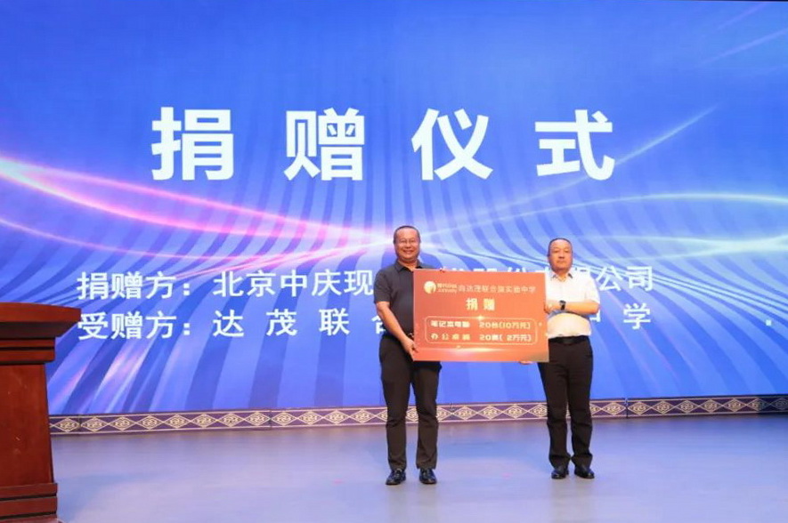 9月1日,2023-2024年度包頭市城鄉學校結對共建簽約儀式暨“組團式”支教幫扶出征儀式在達茂旗融媒體中心舉行,包頭市昆都侖區教育局和達茂聯合旗教育局雙方代表簽訂了《城鄉學校結對共建框架協議》,并啟動支教幫扶組團授旗出征儀式。會上,現代中慶向達茂旗捐贈筆記本電腦和辦公桌椅,成為幫扶達茂旗團隊的重要一員。