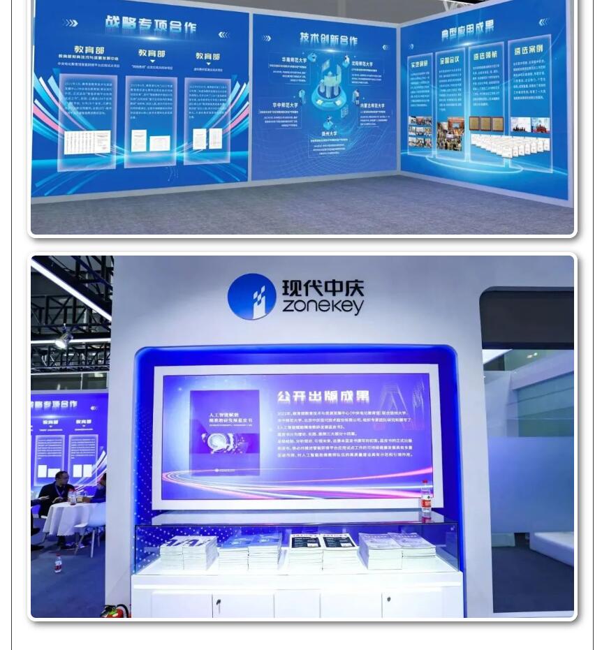 AI教研應用成果展區展示了現代中慶與教育部級項目、全國師范類院校的戰略合作,并產出典型應用與公開出版等多項成果。