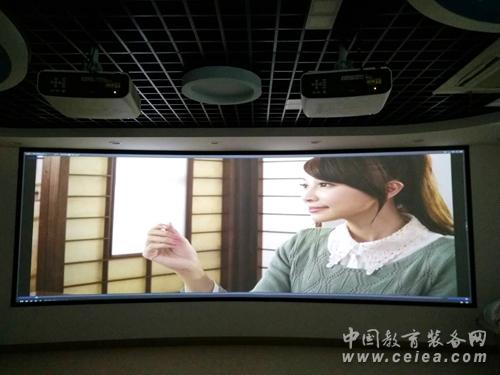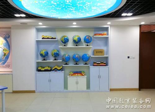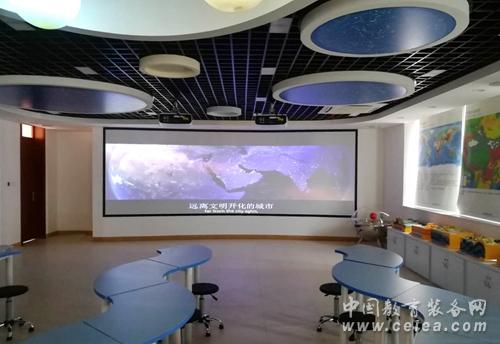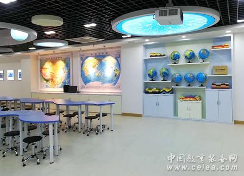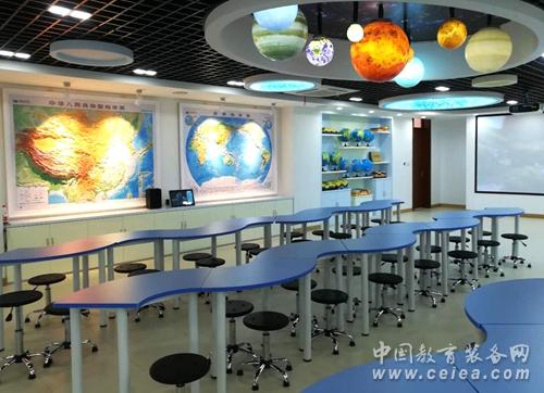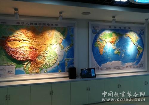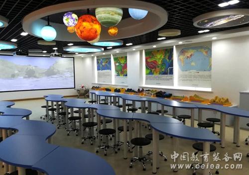 復興中學數字化地理專用教室占地140平方米,教室里配備了數字立體地形、環幕示教系統、地理實驗套裝、地形地貌模型等。在設計上豪華明朗又充滿科技感,與以往專用地理教室相比,教室吊頂層不僅有宇宙星空演示用的天文穹頂,還增加了懸掛式立體太陽系星球,在燈光的襯托下仿佛置身于其中,宇宙的無窮奧秘等著你去探索,這種情境式的教學環境能使學生快速進入學習地理的狀態,提高課堂效率。