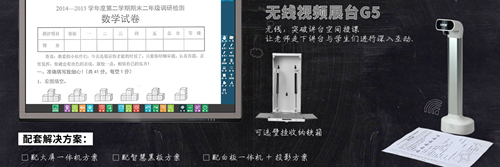 這款無線展臺新品G5,其精致的產品外觀,直立無橫臂設計,老師只需開啟電源開關,打開軟件,就可以簡單而輕松的互動教學。G5采用分離式充電底座,實現了產品的無線充電。同時在電量不足的情況下,還支持使用移動電源充電,保證教學不受影響。
