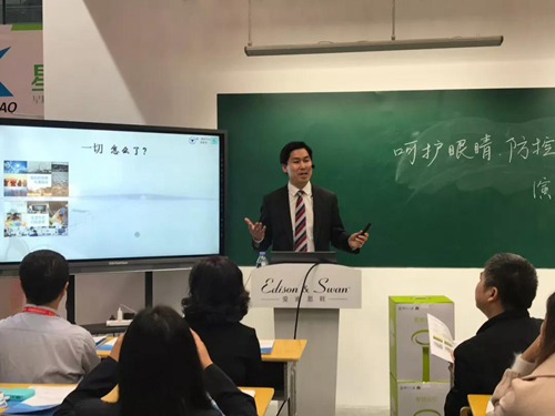浙江大學附屬第二醫(yī)院眼科中心視光部主任、全國兒童近視防控公益科普領頭人、《孩子的護眼寶典》合著者之一倪海龍醫(yī)生,也專程從杭州趕來“愛迪思旺”教室健康照明的展位,就《呵護眼睛、防控近視、光明未來》的主題進行了宣講,也提請家長注意學習光環(huán)境,尤其是學校教室的學習光環(huán)境對孩子眼健康的影響。