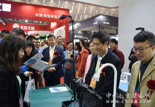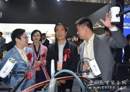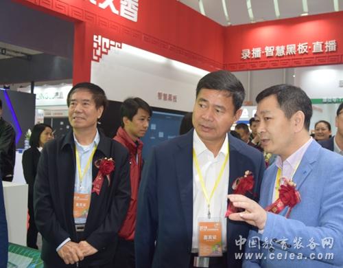 ▲中國教育裝備行業協會會長王富、廣東省教育廳副巡視員邱克楠等領導前往企業展臺參觀