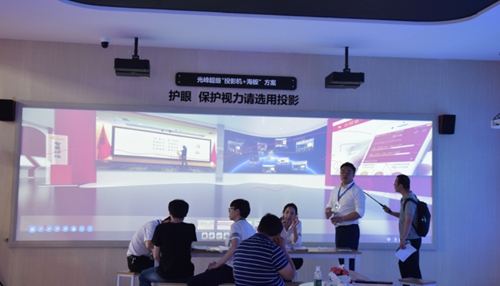 光峰高清超短焦投影方案:光峰激光高清教育擁有1080P的分辨率,超短焦投影,小的安距離投射大畫面。傳統的綠幕黑板+智能一體機搭配使用,符合當前老師授課的教學習慣,又滿足了學校對高清、大畫面、長壽命的需求。
