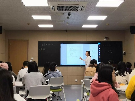 筆者旁聽并記錄了本次匯報課的全過程,本節課課程主題為小學數學《三角形的分類》,應用了奧威亞錄播系統,青鹿智慧課堂系統,應用了學案、分組教學等教學法,匯報授課教師為小學教育(數學方向)大三學生,整體效果令人滿意,其教學流程如下: