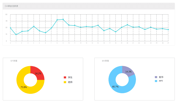 智能分析教研數據,實現對老師和學生的課堂活動的實時監測、自動跟拍、準確定位的智能操作,同時完成S-T教學行為數據精細化采集,真實還原整個課堂教學情境并自動匯聚于資源管理平臺。實現為教研督導提供學生專注度變化曲線圖、多媒體使用率、老師與學生互動頻次等數據,智能分析成簡潔明了的數據圖譜。