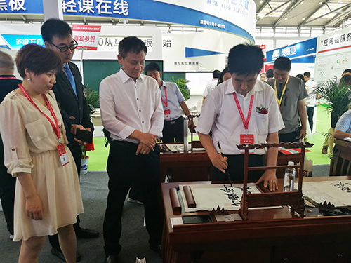 教育部關(guān)心下一代工作委員會常務(wù)副主任、中國教育裝備行業(yè)協(xié)會會長王富蒞臨展位,體驗智慧書法教室并給出高度評價。