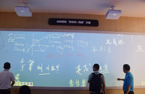 光峰科技超級(jí)“投影機(jī)+海板”投影方案:兩臺(tái)光峰超短焦高清高亮投影機(jī)融合,投射出250吋的大畫(huà)面,滿足大型教室、會(huì)議室、階梯教室的需求。應(yīng)用ALPD激光顯示技術(shù),亮度高達(dá)5500的流明,不懼環(huán)境光,即使在明亮的環(huán)境中,也能夠讓學(xué)生看到清晰亮麗的畫(huà)面,讓教學(xué)更精彩。
