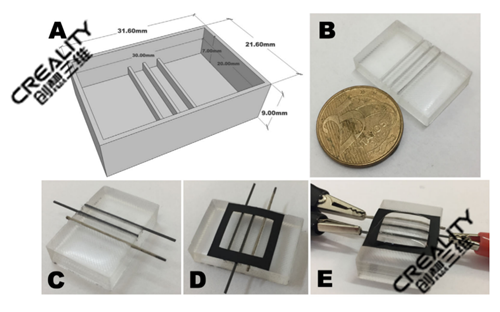 電化學平臺的制造步驟:(A)用于PDMS設備原型的3D打印模具的CAD設計。內(nèi)部浮雕結(jié)構為長20 mm×寬600μm×高1 mm; (B)使用3D打印機模具獲得的PDMS裝置;(C)具有集成工作電極,偽參比電極和對電極的PDMS微型電池; (D)用膠帶定界的電極的幾何面積,以及(E)電化學平臺