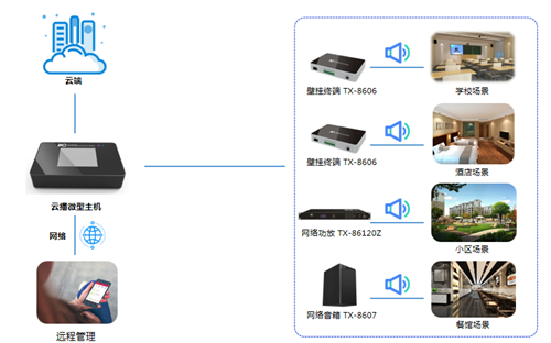itc云播是為校園、社區公園、餐飲店、超市、酒店等小型應用場景量身打造靈活便捷管控的好音質廣播系統解決方案,具有網絡化、APP化、云接入、高保真等系統特點。