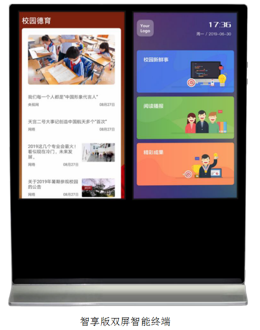 觸控多媒體雙屏展示、管理后臺個性化配置管理、互聯網技術團隊專業支 持,為學校創建安全、高效、可控的德育文化推廣窗口。