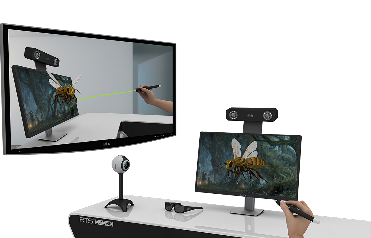RTS-3DESK是全息3D智能立體交互系統應用于桌面型3D交互的一種產品形態,主要是基于RTS-DINO雙目紅外光學相機系統來實現三維定位,通過輕量級的交互筆對全息3D場景內容實時操控,將3D顯示載體用桌面式3D顯示設備呈現,從而構建出一套可交互的桌面式全息3D顯示系統。