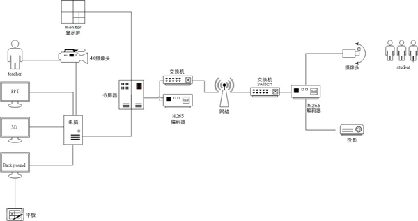 通過手機或平板等終端控制PPT課件、AR影像、背景影像的7種應用模式輸出組合,呈現在聽課端。通過局域網、云端物聯服務平臺可實現遠程的系統監控和管理。